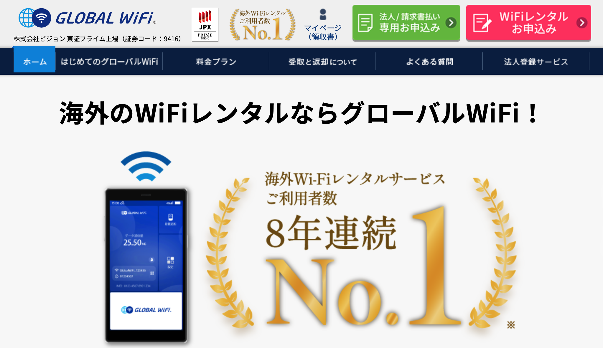 グローバルWiFiは、WiFiレンタルサービスの中でも最も知名度が高く、利用者数や対応国数の面でも業界トップクラスのサービスです。空港受取や返却の仕組み、日本語でのサポート体制などが一通り整っており、初めての方でも安心して使いやすいのが特徴です。